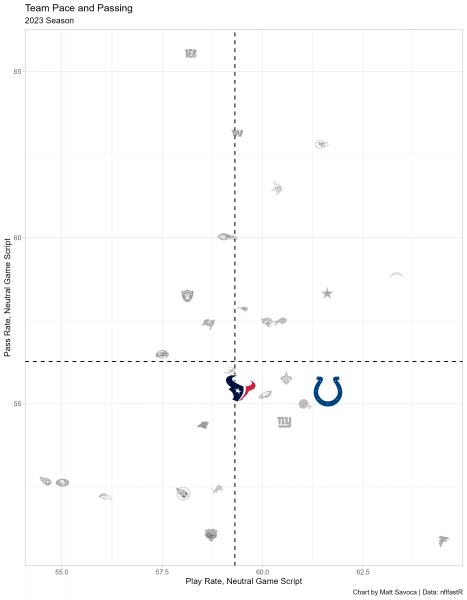 This chart represents the general offensive strategies for each team when the game outcome is still in question (win probability between 20% and 80%). The final two minutes of each half are also excluded. We’ll include last year’s statistics through Week 4 of the regular season. Teams in the upper-right quadrant pass more often and play faster than the average NFL team in neutral game scripts, and conversely, teams in the lower-left quadrant play slower and run more often than the average NFL team.