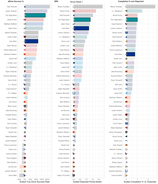 Tua Tagovailoa’s 2023 season has been his best as a pro. He’s one of only two quarterbacks (alongside Brock Purdy) in the top five in CPOE, true drive success rate, and EPA per game. He’s second in AYA, and first in accuracy rating according to PlayerProfiler. Unlike Allen, Tagovailoa’s impact with his legs is essentially nonexistent, averaging only 2.1 rushes per game and not yet scoring a rushing touchdown this season. Despite this, he’s 16th in fantasy points per game. His ability to maintain high-level play despite a banged-up shoulder, which could particularly limit his effectiveness on deep passes, will be crucial in the high-stakes matchup against the Bills.