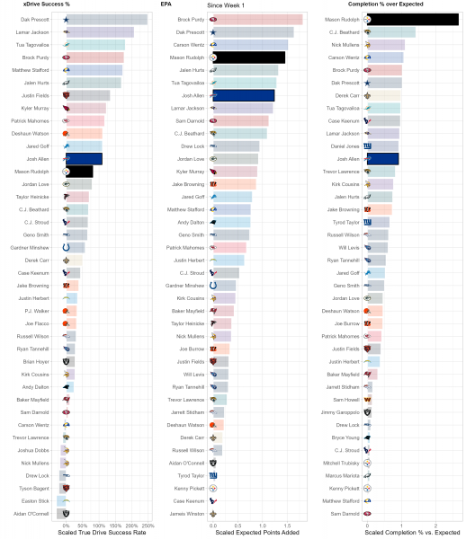 While there may be 22 people on the field for every play, each play and game is heavily dictated by the performance of each team’s quarterback. While efficiency isn’t everything for quarterbacks, it is the best indicator of future performance, so we use a trio of metrics to suss out top performers at the position compared to lackluster ones. xDrive Success %, or True Drive Success Rate, is a measurement of a QB’s ability to turn drives into scores weighted by sample size. EPA or Expected Points Added, is a measurement of the QB’s contribution, both running and throwing, to the team’s scoring and production vs. the average NFL team. Completion % over Expected (CPOE)represents the accuracy and efficiency of a QB’s passes compared to league expectations.