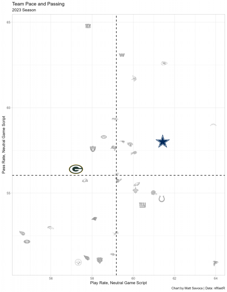 This chart represents the general offensive strategies for each team when the game outcome is still in question (win probability between 20% and 80%). The final two minutes of each half are also excluded. We’ll include last year’s statistics through Week 4 of the regular season. Teams in the upper-right quadrant pass more often and play faster than the average NFL team in neutral game scripts, and conversely, teams in the lower-left quadrant play slower and run more often than the average NFL team.