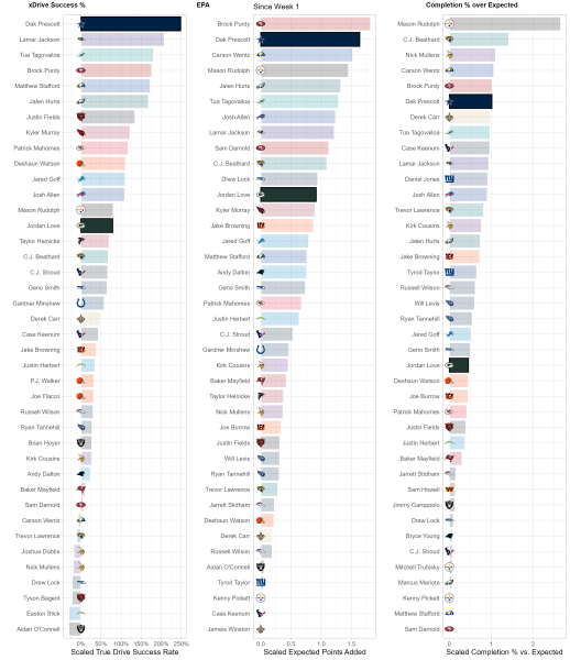While there may be 22 people on the field for every play, each play and game is heavily dictated by the performance of each team’s quarterback. While efficiency isn’t everything for quarterbacks, it is the best indicator of future performance, so we use a trio of metrics to suss out top performers at the position compared to lackluster ones. xDrive Success %, or True Drive Success Rate, is a measurement of a QB’s ability to turn drives into scores weighted by sample size. EPA or Expected Points Added, is a measurement of the QB’s contribution, both running and throwing, to the team’s scoring and production vs. the average NFL team. Completion % over Expected (CPOE)represents the accuracy and efficiency of a QB’s passes compared to league expectations.