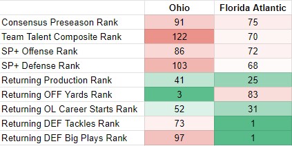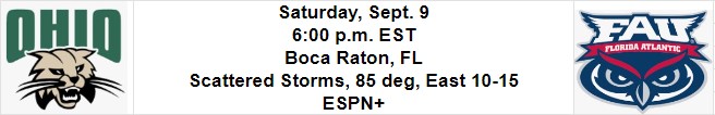 While San Diego State was a tough test on the road, Ohio will face its most complete opponent so far this week as FAU presents a well-balanced offense led by a talented, experienced quarterback in Thompson, along with a quality offensive line and experienced playmakers at the skill positions. Last year, Ohio finished as one of the worst teams in the nation against the pass. While their cornerbacks are improved from last year, look for FAU to spread out the Ohio defense and allow Thompson to try to pick apart the Bobcat secondary. This should also open up the run game for McCammon and company.