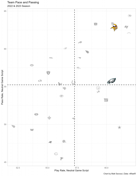 This chart represents the general offensive strategies for each team when the game outcome is still in question (win probability between 20% and 80%). The final two minutes of each half are also excluded. We’ll include last year’s statistics through Week 4 of the regular season. Teams in the upper-right quadrant pass more often and play faster than the average NFL team in neutral game scripts, and conversely, teams in the lower-left quadrant play slower and run more often than the average NFL team.