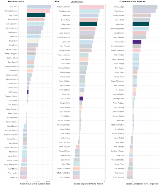 From an analytical standpoint, Kirk Cousins often takes flack for playing like a replacement-level quarterback. And when scaling the primary efficiency metrics above, the data mostly bear that out. Since the beginning of last season, Cousins has been ever-so-slightly above league average in terms of his ability to turn drives into scores or to make strong decisions on a per-play basis (as measured by EPA in the middle column). He does, however, complete passes at a higher rate than we expect, likely due to the plethora of skill talent he has been graced with during his tenure in Minnesota. PFF graded Cousins as their ninth-best quarterback a season ago.