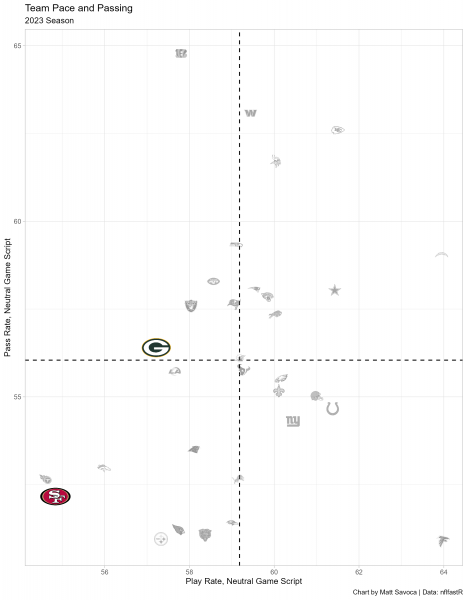 This chart represents the general offensive strategies for each team when the game outcome is still in question (win probability between 20% and 80%). The final two minutes of each half are also excluded. We’ll include last year’s statistics through Week 4 of the regular season. Teams in the upper-right quadrant pass more often and play faster than the average NFL team in neutral game scripts, and conversely, teams in the lower-left quadrant play slower and run more often than the average NFL team.
