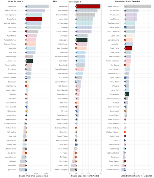Surrounded by an embarrassment of talent, Brock Purdy's stellar play generated MVP buzz for much of the season, though his performance against Lamar Jackson and the Ravens in Week 16 might have dampened his chances. Purdy finished 2023 in the top five in true drive success rate and in EPA per game, where he topped the entire NFL. Purdy was number one in true passer rating, QBR, total EPA, and adjusted yards per attempt. His rushing game, like Love, isn’t a prominent part of his game, as he averages just 2.4 attempts per game, but that hasn’t stopped him from consistent fantasy production. Even playing alongside Christian McCaffrey, one of the most prolific running backs of this era, Purdy still ranked sixth at his position in fantasy points per game.