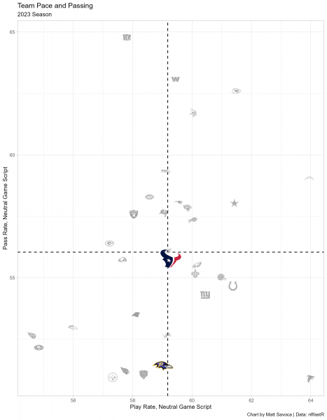 In contrast, the Ravens exhibit a more methodical approach, operating at a league-average pace but leaning heavily on their rushing attack in neutral situations. Ranking 31st in pass plays per game and 28th in overall pace, Lamar Jackson’s offense can accelerate when necessary, but many times haven't often needed to, given their league-leading average scoring differential in 2023.