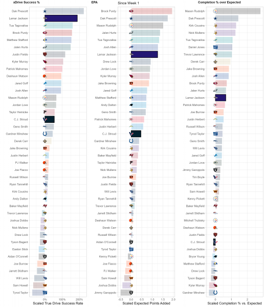 While there may be 22 people on the field for every play, each play and game is heavily dictated by the performance of each team’s quarterback. While efficiency isn’t everything for quarterbacks, it is the best indicator of future performance, so we use a trio of metrics to suss out top performers at the position compared to lackluster ones. xDrive Success %, or True Drive Success Rate, is a measurement of a QB’s ability to turn drives into scores weighted by sample size. EPA or Expected Points Added, is a measurement of the QB’s contribution, both running and throwing, to the team’s scoring and production vs. the average NFL team. Completion % over Expected (CPOE)represents the accuracy and efficiency of a QB’s passes compared to league expectations.