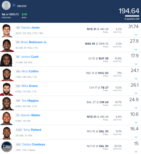 Other than the previously mentioned Giants stack, Brian Robinson was the most unique piece of this lineup. Robinson was a salary swivel off of David Montgomery, who projected as one of the most popular running backs on the slate and ended up in 17% of Sunday Million lineups.