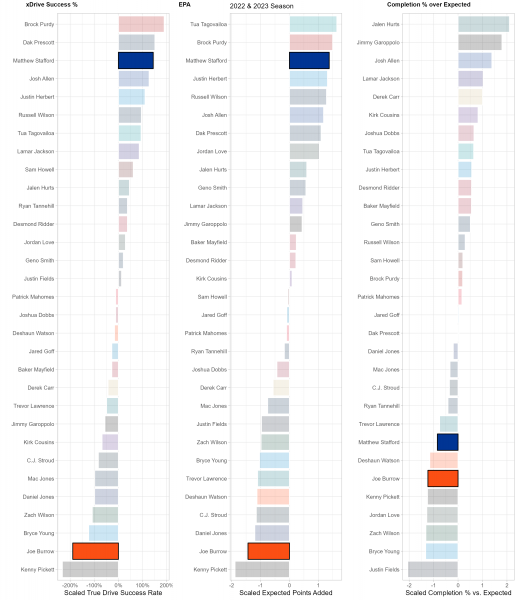 While there may be 22 people on the field for every play, each play and game is heavily dictated by the performance of each team’s quarterback. While efficiency isn’t everything for quarterbacks, it is the best indicator of future performance, so we use a trio of metrics to suss out top performers at the position compared to lackluster ones. xDrive Success %, or True Drive Success Rate, is a measurement of a QB’s ability to turn drives into scores weighted by sample size. EPA or Expected Points Added, is a measurement of the QB’s contribution, both running and throwing, to the team’s scoring and production vs. the average NFL team. Completion % over Expected (CPOE)represents the accuracy and efficiency of a QB’s passes compared to league expectations.