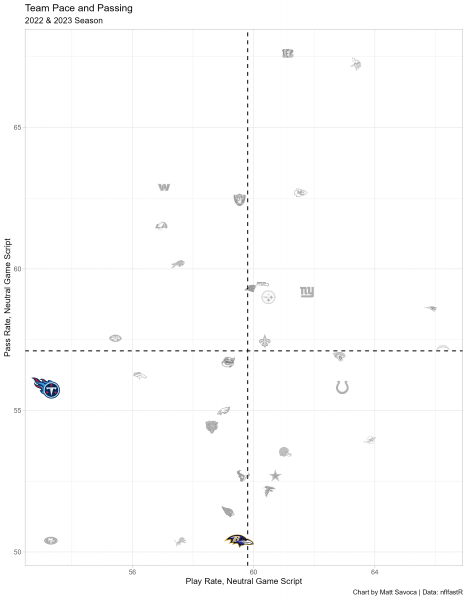 This chart represents the general offensive strategies for each team when the game outcome is still in question (win probability between 20% and 80%). The final two minutes of each half are also excluded. We’ll include last year’s statistics through Week 4 of the regular season. Teams in the upper-right quadrant pass more often and play faster than the average NFL team in neutral game scripts, and conversely, teams in the lower-left quadrant play slower and run more often than the average NFL team.
