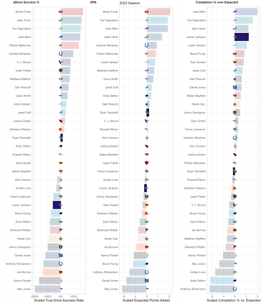 While there may be 22 people on the field for every play, each play and game is heavily dictated by the performance of each team’s quarterback. While efficiency isn’t everything for quarterbacks, it is the best indicator of future performance, so we use a trio of metrics to suss out top performers at the position compared to lackluster ones. xDrive Success %, or True Drive Success Rate, is a measurement of a QB’s ability to turn drives into scores weighted by sample size. EPA or Expected Points Added, is a measurement of the QB’s contribution, both running and throwing, to the team’s scoring and production vs. the average NFL team. Completion % over Expected (CPOE)represents the accuracy and efficiency of a QB’s passes compared to league expectations.