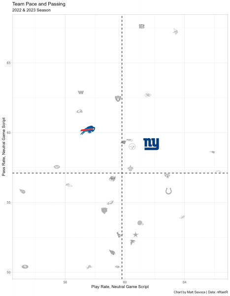 This chart represents the general offensive strategies for each team when the game outcome is still in question (win probability between 20% and 80%). The final two minutes of each half are also excluded. We’ll include last year’s statistics through Week 4 of the regular season. Teams in the upper-right quadrant pass more often and play faster than the average NFL team in neutral game scripts, and conversely, teams in the lower-left quadrant play slower and run more often than the average NFL team.