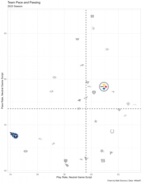 The Pittsburgh Steelers, who were unsure if Kenny Pickett would start earlier in the week, will have the starting quarterback under center for this one. With a record teetering at 4-3, the Steelers sit as 3-point favorites at home against Tennessee, who sit at a 3-4, tied for third in their division. The implied point is at a mere 37 points. This reflects the conservative nature of both teams' offensive schemes, with each generally showing a distinct preference for production via the run game. The Steelers, counterintuitively attempt more passes than average, yet their inability to sustain drives has been a notable detriment to their overall scoring ability. They're fourth in the league in pace but only 21st in pass plays per game, a statistic that highlights their inefficiency in converting plays to points, and their squandering of an above-average pass rate in neutral game scripts.