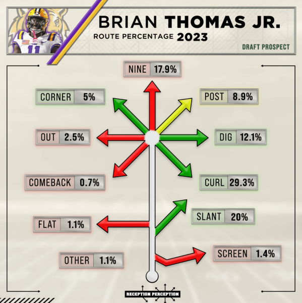 “You’ll notice that Thomas’ route tree is pretty stripped down. A whopping 67.1% of Thomas’ charted routes were a slant, curl, or nine. It’s not the most limited route tree we’ve seen, but it’s something to note on his profile.”