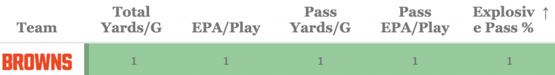 Cleveland allowed only 185.2 passing yards per contest, which ranked second in the NFL and was first in the following metrics.