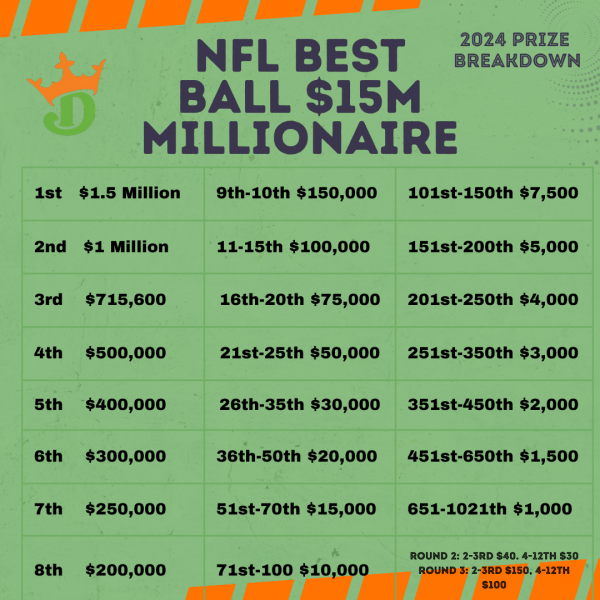 Sit & Go prizes will depend on the size and entry fee of the leagues and there are many tournaments to enter, but a breakdown of prizes for DraftKings flagship $15M tournament is found below.