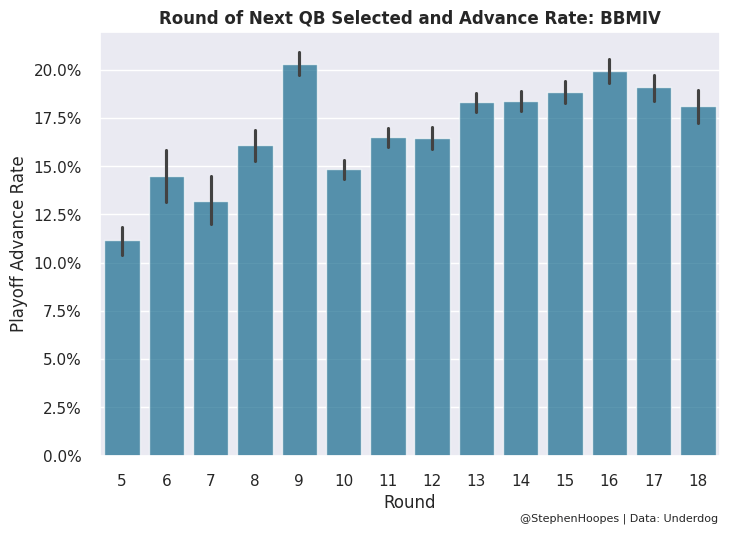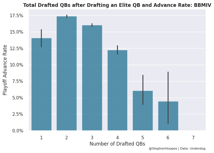 For this analysis, I’m considering an elite QB to be one that you drafted in the first four rounds. The graph below shows the playoff advance rate of entries that drafted an elite QB. The x-axis is the total number of drafted QBs, including the elite QB. The y-axis is the average playoff advance rate of those entries. What you’ll notice is stopping at two total QBs was optimal in BBMIV. This was the only construction where drafters had an advance rate above our 16.7% benchmark.