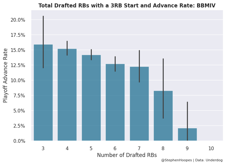 I know, starting a draft with three consecutive RBs does not sound very extreme. But it truly is given the current WR meta. In BBMIV, about 2% of all entries started with three straight RBs. And the advance rate of those teams was poor, to say the least. The graph below shows the playoff advance rate of entries that started with three RBs. The x-axis is the total number of drafted RBs, including the three with which the entry started. The y-axis is the average playoff advance rate of those entries. What you’ll notice is that each additional RB drafted lowered an entry’s playoff odds.
