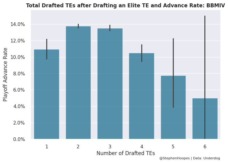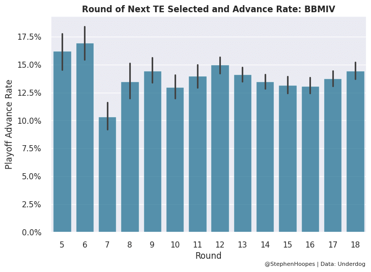 As mentioned previously, BBMIV was not the year for elite TE builds. The advance rate for every number of TEs was well below our 16.7% benchmark. And unlike with QBs, there wasn’t a clear optimal number of selected TEs. Stopping at two or taking a third performed almost equally well. However, stopping at two was slightly better so let’s focus on those entries.