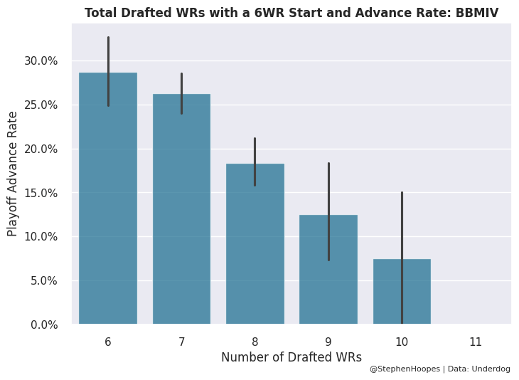 Anecdotally, more drafters are starting with extreme WR positions this year. And with those drafters in mind, let’s find out when you should stop drafting the position. The graph below shows the playoff advance rate of entries that started with six WRs. The x-axis is the total number of drafted WRs, including the six with which the entry started. The y-axis is the average playoff advance rate of those entries. What you’ll notice is that each additional WR drafted lowered an entry’s playoff odds. And six WRs is the first time where that was the case in BBMIV.