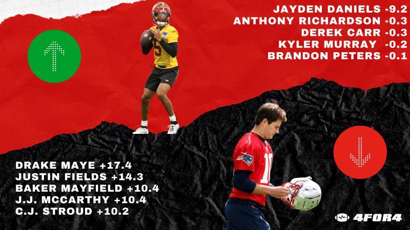 No QB has had a significant jump over the last month other than Jayden Daniels. Last year's Heisman Trophy Winner, Daniels, is a dual-threat upside quarterback, which regularly provides a boost in draft value for fantasy managers.