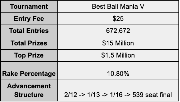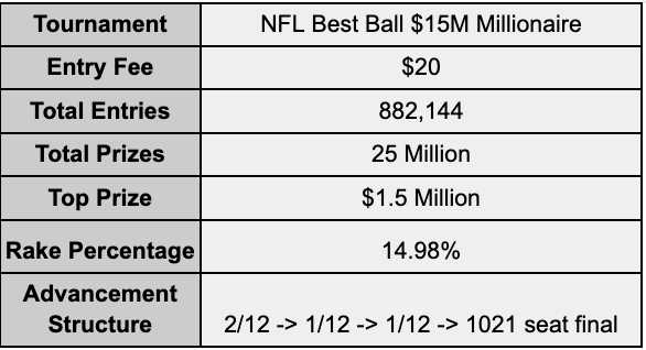 Each round you advance through, there is typically an associated payout. For example, in Underdog’s Best Ball Mania V, the top two scoring teams in Weeks 1-14 from each draft move to the next round and get paid their entry fee ($25) plus a bit more (+$10). Making it through each round can be very difficult. Accordingly, the payouts become progressively higher. Every finalist in Best Ball Mania gets $3,750 and has a chance at $1.5 Million.