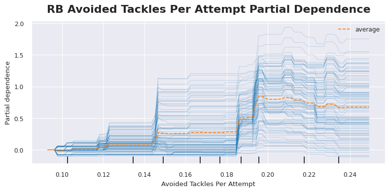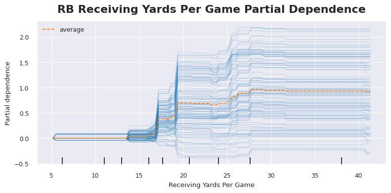 The graph below is a partial dependence plot (PDP) of receiving yards per game. PDPs are a great way to shine some light on the inner workings of machine learning models. They show how each variable affects the model’s predictions while averaging out the effects of the other variables. It’s easiest to focus on the orange line in the graph. As that orange line increases above zero on the y-axis, it means RBs in that range typically score more fantasy points next season. The main takeaway here is that RBs with more than 20 receiving yards per game are more likely to have massive fantasy seasons the next year. Alternatively, fewer than 15 receiving yards per game is a red flag.
