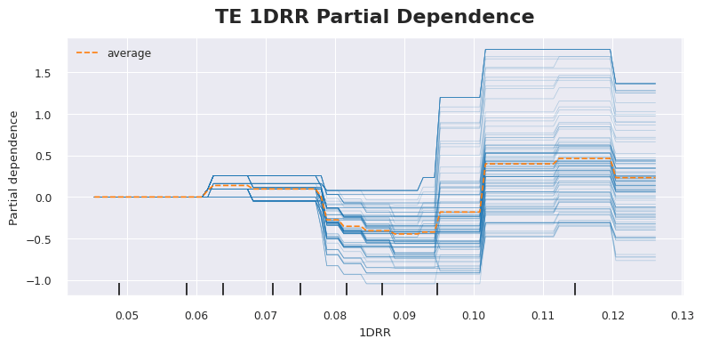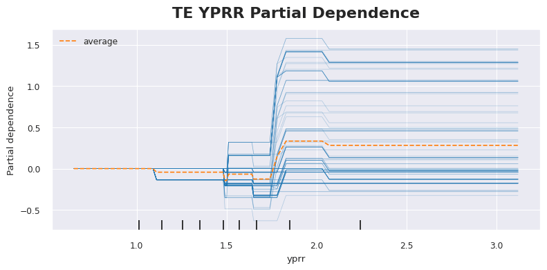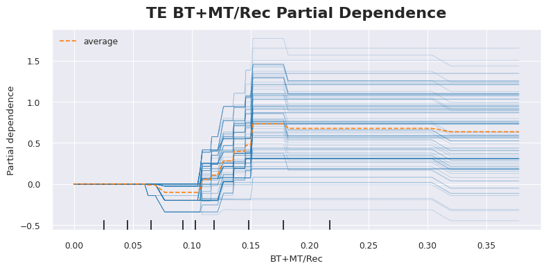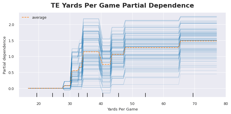 Now athleticism is the primary difference between the talent evaluation of TEs versus WRs. If a TE isn’t a special player, they might be tasked with blocking an edge rusher rather than running a route. And that’s great for your points per block league but not ideal for most of us. The proxy for athleticism that provided the most model gain was broken and missed tackles per reception (BT+MT/Rec). The graph below is a PDP of just that. We start seeing positive fantasy point outcomes when a TE avoids being tackled on about 10% of his receptions. And then we see the best outcomes when that rate of tackle avoidance exceeds 15%.