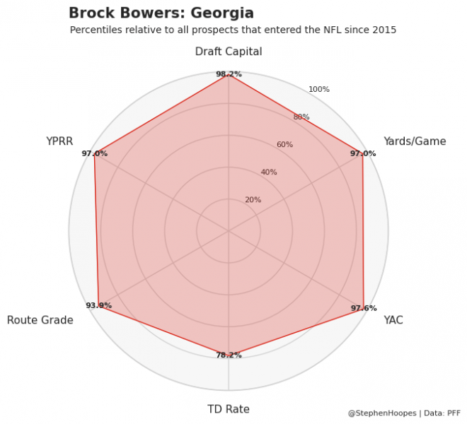 I wanted to call out Brock Bowers here despite not having any NFL stats for him yet. The graph below shows a few key stats from Bowers’ college career. With the exception of TD rate, which as we saw earlier isn’t consistent, Bowers is at least a 94th percentile prospect in every stat we care about. The reason he’s only being drafted as TE10 in Underdog drafts is the Raiders offensive environment. We don’t anticipate this team to have a very successful passing attack and much of the volume is likely to go to Davante Adams. But I still want to make a bet on a young, extremely talented TE despite the red flags of the Raiders offense.