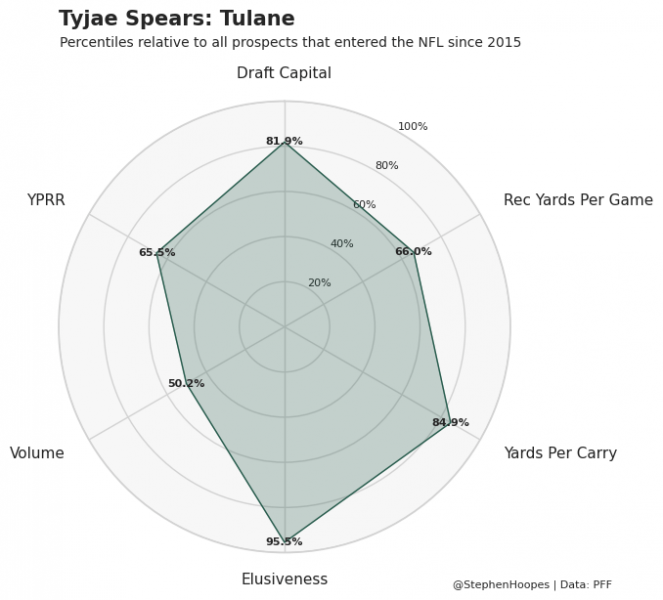 Coming into the 2023 NFL Draft, the primary knock on Spears was his injury history. He had suffered two torn ACLs in the past, and at the NFL Combine, tests revealed that he does not have an ACL in one of his knees and that he has arthritis. However, the Titans felt comfortable enough with his medicals to select him in the third round at pick 81 overall. With the exception of his injury history, Spears was an excellent prospect. As shown in the graph below, Spears was a particularly good receiving prospect, ranking in the 66th percentile for both receiving yards per game and yards per route run (YPRR). In addition, he showed an elite ability to avoid tackles, ranking in the 96th percentile for elusiveness.