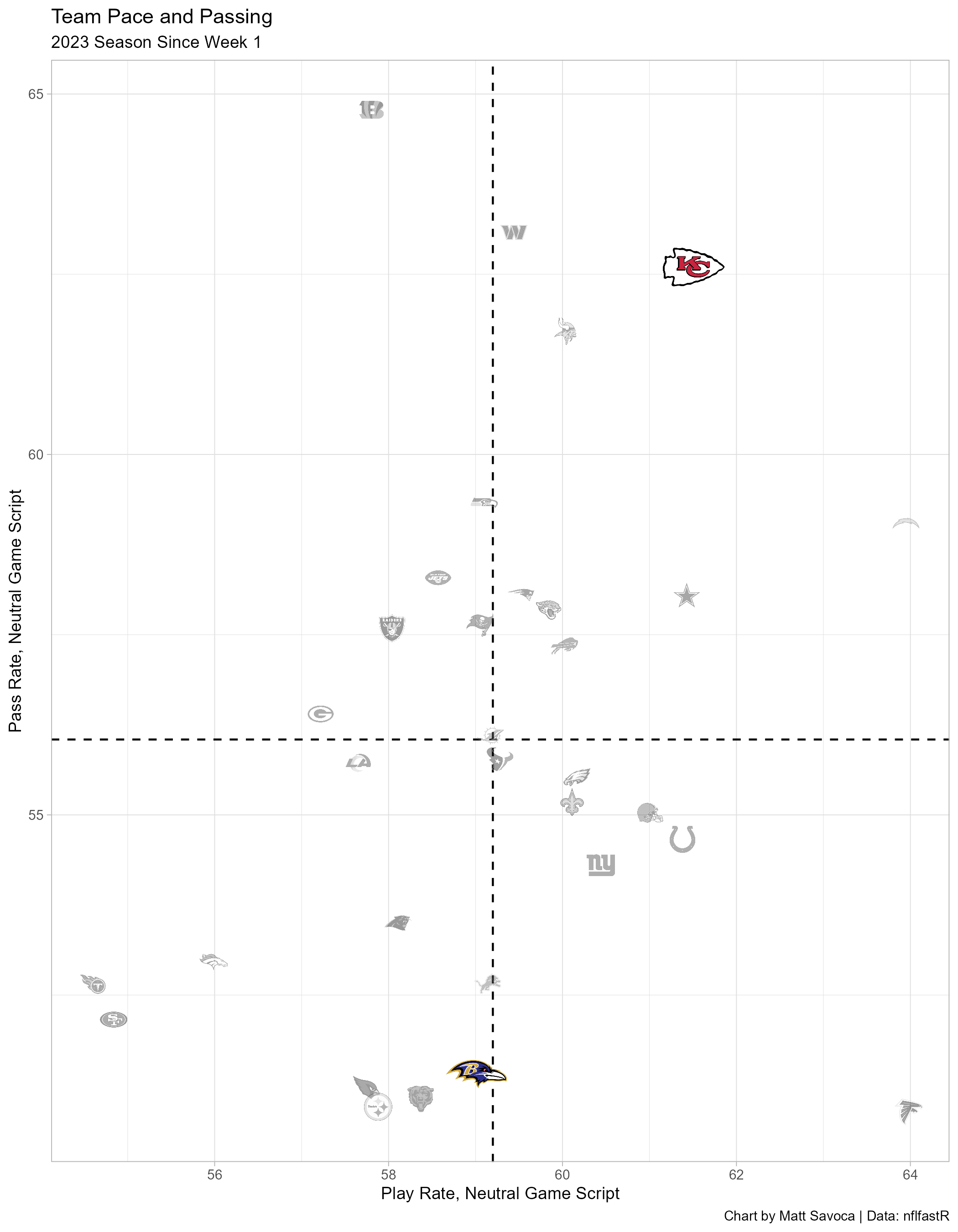 This chart represents the general offensive strategies for each team when the game outcome is still in question (win probability between 20% and 80%). The final two minutes of each half are also excluded. Teams in the upper-right quadrant pass more often and play faster than the average NFL team in neutral game scripts, and conversely, teams in the lower-left quadrant play slower and run more often than the average NFL team.