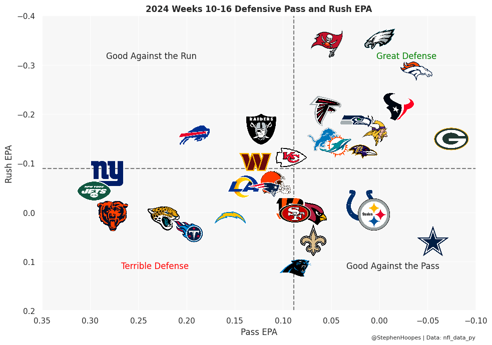 The graph below shows defensive pass EPA on the x-axis and rush EPA on the y-axis. And we’re only filtering for Weeks 10-16 when the Ravens have been able to limit those explosive pass plays. You’ll find the Ravens in the top-right with the league’s best defenses. For fantasy, that means we should see tougher sledding for the Texans in the championship game. And the Texans have been decimated at WR, with both Stefon Diggs and now Tank Dell out for the year. Beyond Nico Collins and possibly Dalton Schultz if you’re in a pinch at TE, you’re not starting any other Texans pass catcher this week.