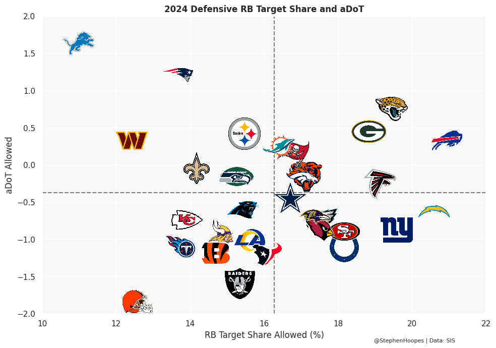 The graph below shows the percentage of targets that a defense allows to opposing RBs on the x-axis and the aDoT of those targets on the y-axis. You’ll find the Chargers in the bottom right. They’ve given up the 2nd-highest target share to opposing RBs this year with a below-average target depth. Credit to Jesse Minter’s scheme to force opposing offenses into these low-value attempts. But for fantasy, it boosts Rhamondre Stevenson’s floor in Week 17 despite the tough matchup against this strong Chargers defense.