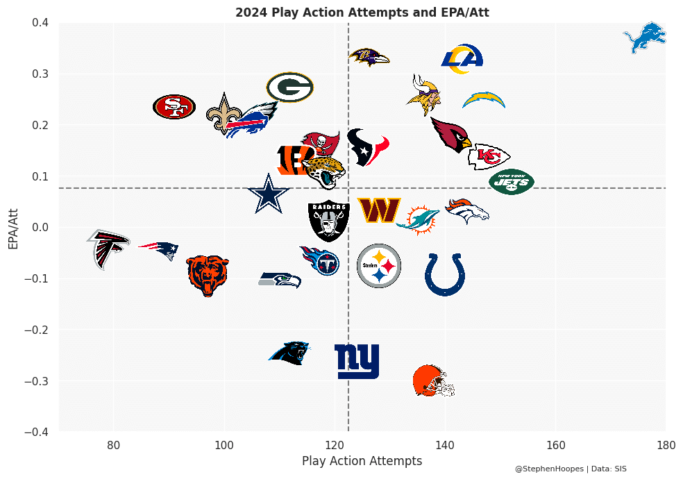 Speaking of excellent, Justin Herbert has excelled lately despite the Chargers’ lack of real NFL weapons. His 0.48 EPA per play and 58.5% success rate in Week 16 were both season highs. And as we’ve discussed in previous weeks, that value is being driven by play-action passes. The graph below shows the number of play-action attempts on the x-axis and EPA per play-action attempt on the y-axis. You’ll find the Chargers in the top-right of the graph. They’re 4th in total play-action attempts this season and 6th in EPA per attempt on that high volume.