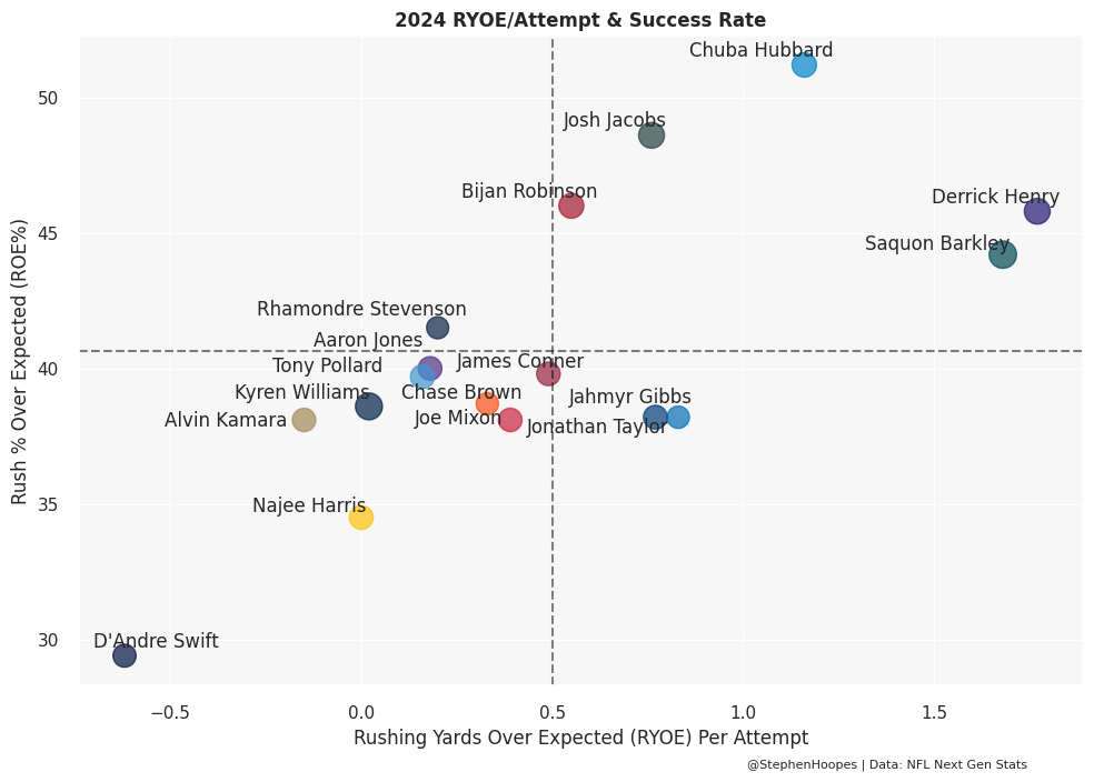 Chuba Hubbard has been absolutely excellent this season for the Panthers. In Week 16, he ran against stacked boxes on 56% of his attempts but still somehow managed 0.36 EPA per attempt. Among RBs with at least 200 attempts, he’s 3rd in rushing yards over expected (RYOE) per attempt. That’s behind only Saquon Barkley and Derrick Henry. And he’s first in Next Gen Stats’ version of success rate.