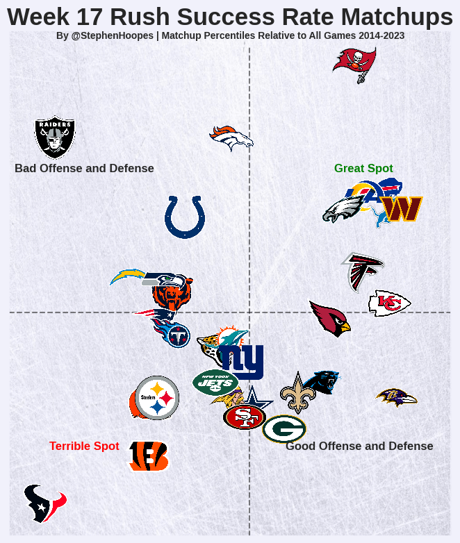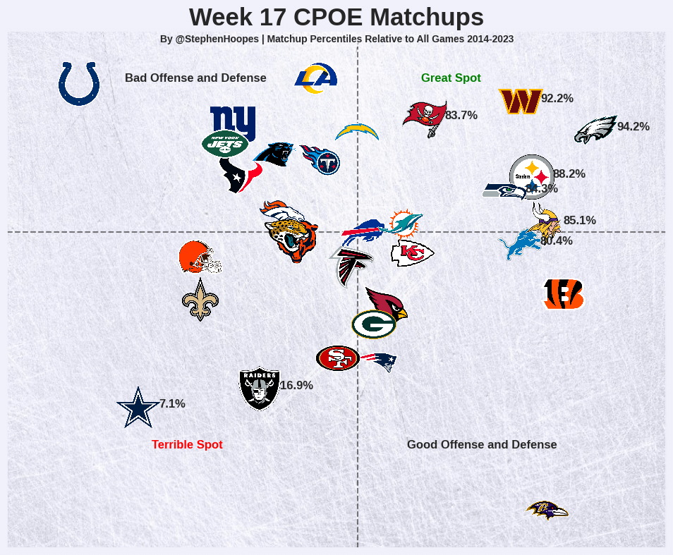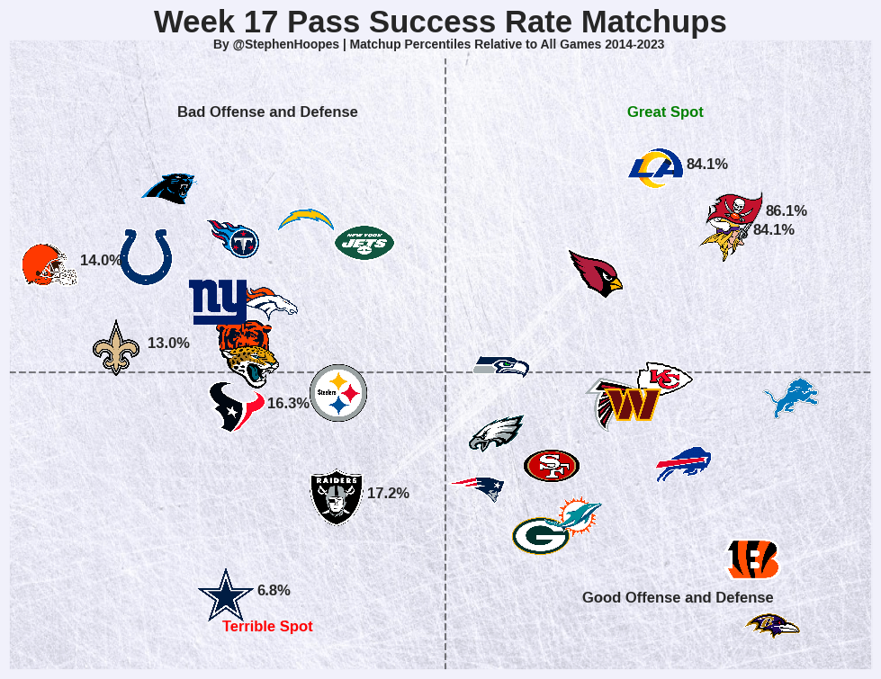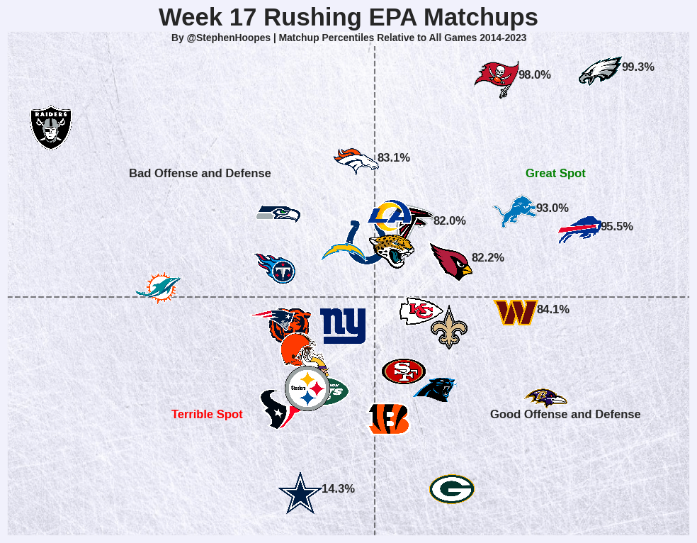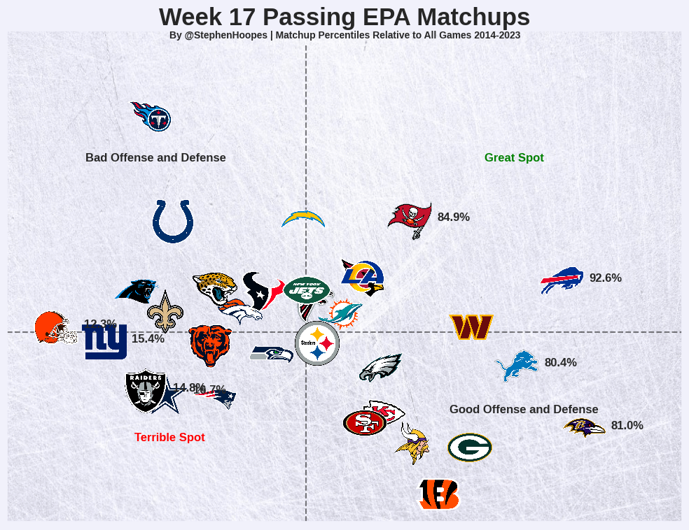 Championship week is here! And if we’re being honest, you probably already have your starting lineup locked in stone. If your team was good enough to get to this stage, you have some studs on your squad. But just in case you’re in a tricky spot, I’ll start this week with the passing and rushing matchups for Week 17. And then I’ll dig into the other things you need to know. As always, feel free to reach out to me on Bluesky with any specific questions.