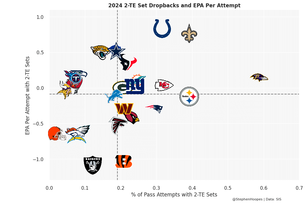 An expectation going into the season was we’d see additional 2-TE sets in 2024. And so far, we’ve seen particular teams outpacing the rest of the league on that front. The graph below shows both the use and efficiency of 2-TE sets Week 1. And while the average NFL team used 2-TE sets at about the same rate as last year, about five teams have distanced themselves from the rest of the league. That’s a significant change from last year when really just the Falcons used a massive dose of 2-TE sets. And there are a few reasons for this change.