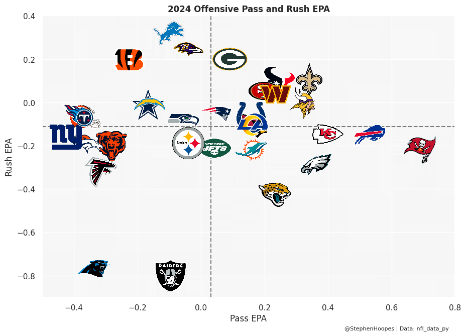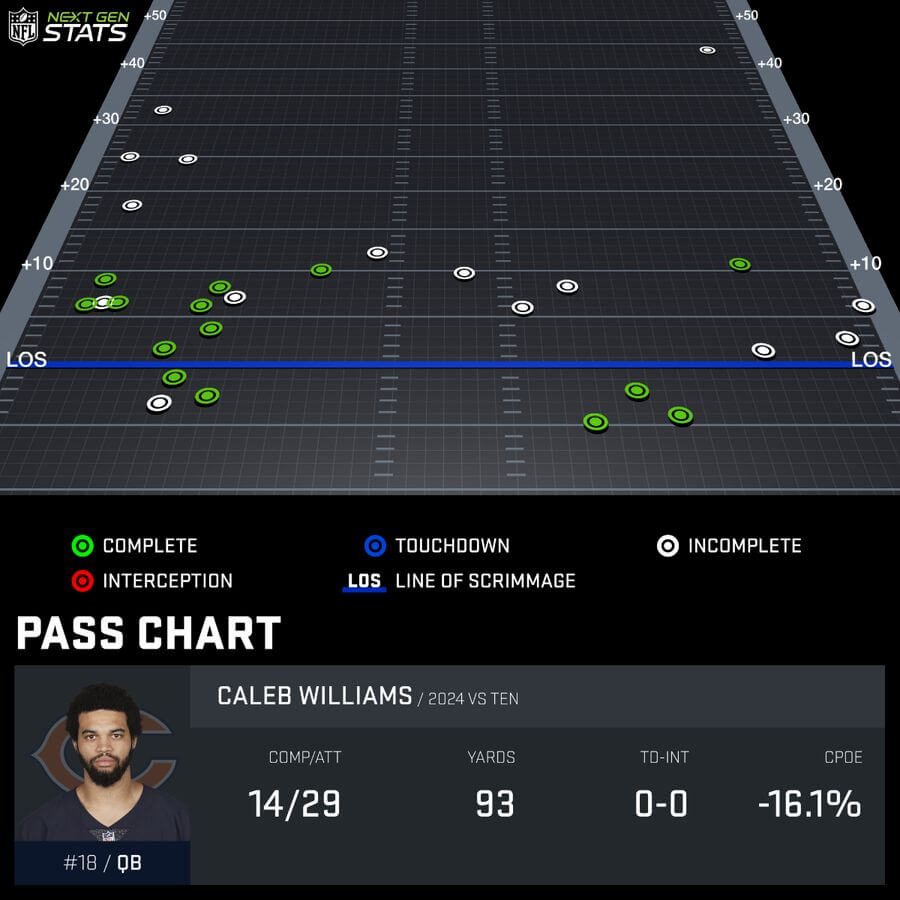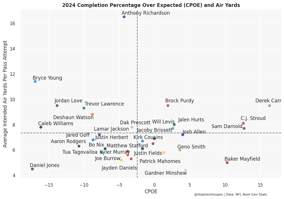 In a week with some truly bad QB performances, Daniel Jones stands out as an outlier. Despite an aDoT just north of four yards, Jones had the worst CPOE on the day. To put a positive light on this, it could have been worse for Nabers. He finished the day with a 5/66/0 line and was the lone efficiency spot for the Giants, generating over 4.2 receiving EPA or 0.6 per target. The Giants lost EPA throwing to any player not named Nabers on the day, with Wan'Dale Robinson's targets being especially inefficient.