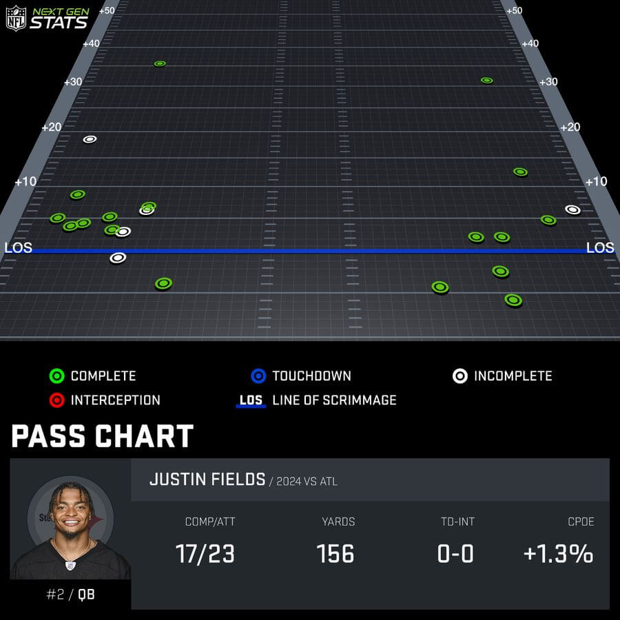 We care about pass locations in fantasy because passes over the middle of the field are typically more efficient than passes to the boundaries. With that in mind, we had some comical passing charts from Week 1. The first is from Justin Fields. He managed 23 passing attempts on the day without a single one to the middle of the field. That’s honestly hard to do. The second is from Caleb Williams. He at least had some attempts toward the middle, but 12 of his 14 completions were to the boundary and he struggled on anything with a target depth beyond 10 yards. I don’t have much optimism for Arthur Smith to design an improved passing game for Week 2. But we can hold out hope for a highly-touted rookie in his first NFL game.