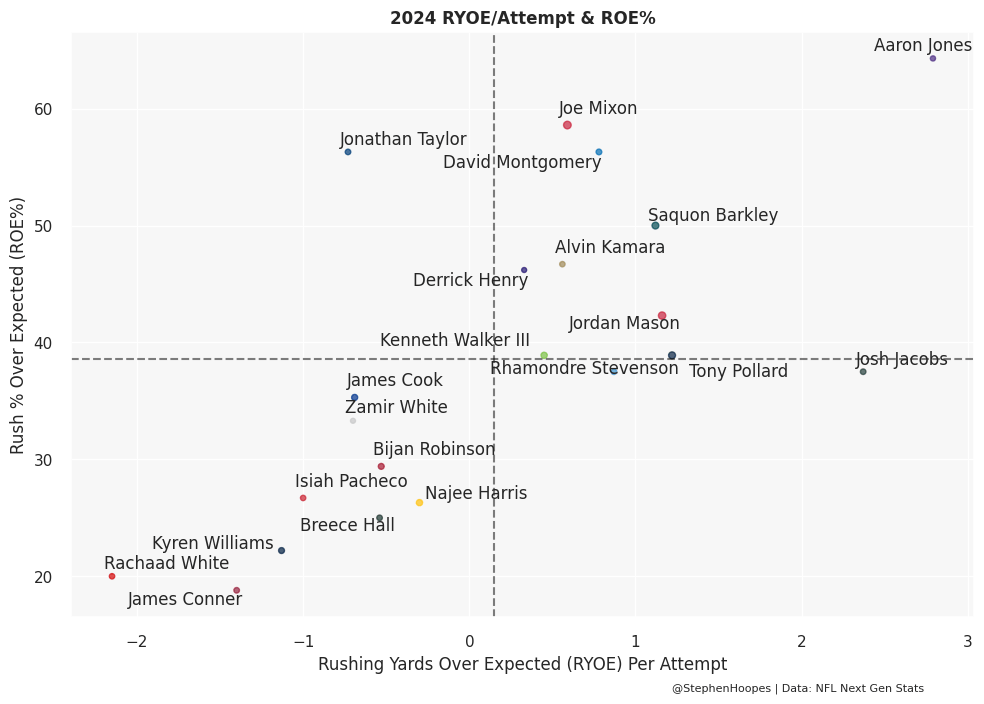 The RYOE graph sets 13 attempts as the minimum qualifying amount. Part of that is to keep J.K. Dobbins off of the graph so he doesn’t fully break it like De'Von Achane did last year. Dobbins’ 9.8 RYOE/attempt is about 3.5 times higher than Aaron Jones in second place. Gus Edwards on a similar number of attempts managed -1.63 RYOE/attempt. The Chargers now get the pleasure of playing the Carolina Panthers in Week 2. Find a way to get Dobbins on your team and into your lineup this week.