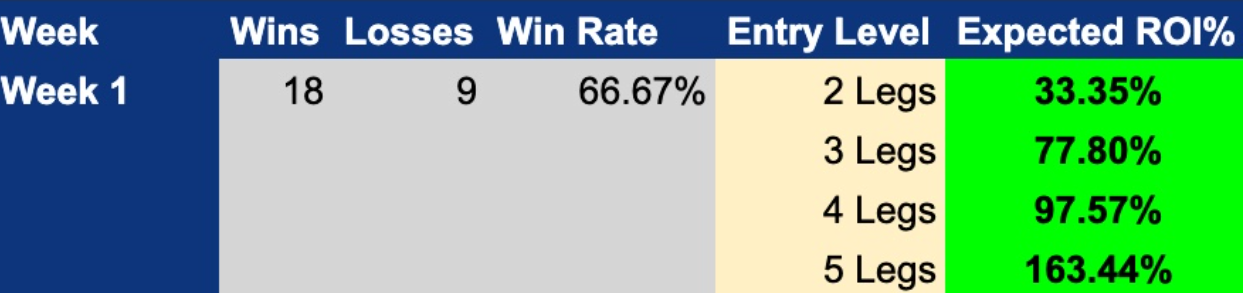 We plan to release at least four entries a week, and we’ll make an effort to have a play released for each slate (TNF, Sunday/SNF, and MNF). In Week 1, we were able to fire off 27 total plays (8 different entries). We also have 20 season-long props pending. In the pre-season, we fired a total of 58 plays for a record of 34-24 (58.62% win rate). This was good for a 20.86% ROI on 3-leg entries, 18.08% on 4-leg entries, and 38.44% on 5-leg entries.