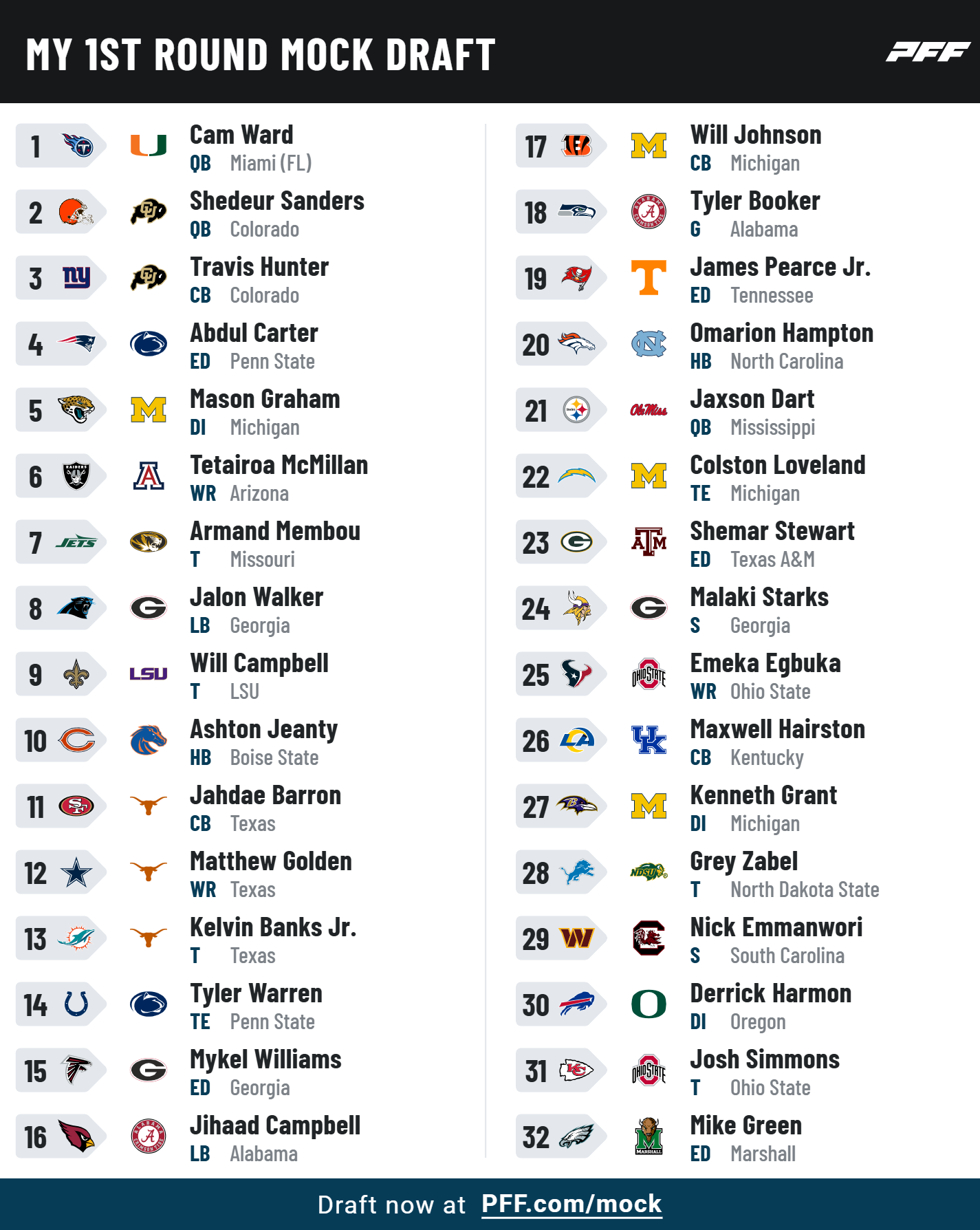 Yes, the Patriots need multiple starters along the offensive line, but they have to take Abdul Carter or Travis Hunter if one of them falls into their lap at no. 4. New England lacks difference-makers on both sides of the ball, and the consensus around the league is that Carter is one of if not the, cleanest prospects in this draft. You can't pass on 'blue chip' talent for a short-term team need.