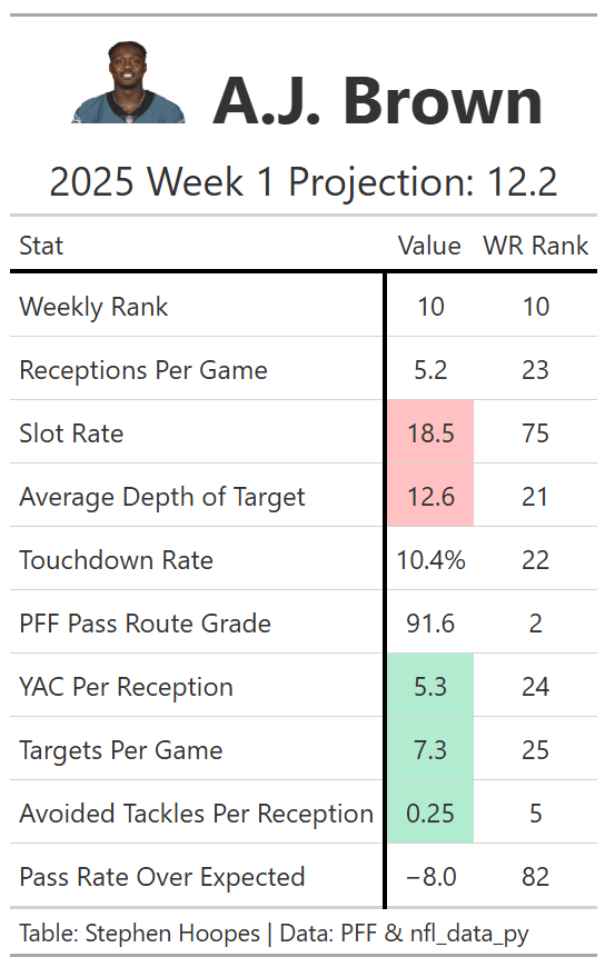 Roses are red, the Eagles are green, A.J. Brown is the best wide receiver I’ve seen. I’m going to get my bias out of the way in the introduction here before giving actionable information on how to play Brown this season. I am both an Eagles fan and specifically an A.J. Brown fan. He was my favorite WR in the league dating back to his days on the Titans. Needless to say, I was ecstatic when we traded for Brown during the 2022 draft. And I think even with my bias aside, you’d be hard-pressed to make the case that Brown is not a top-five real-life NFL WR. Let’s first dig into his talent profile before examining the volume concerns that are rightfully keeping down his ADP.