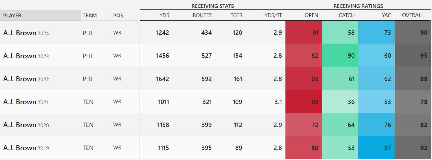 - A.J. Brown is a superstar WR, leading the league in both ESPN Analytics’ Open Score and Overall receiver rating last year.