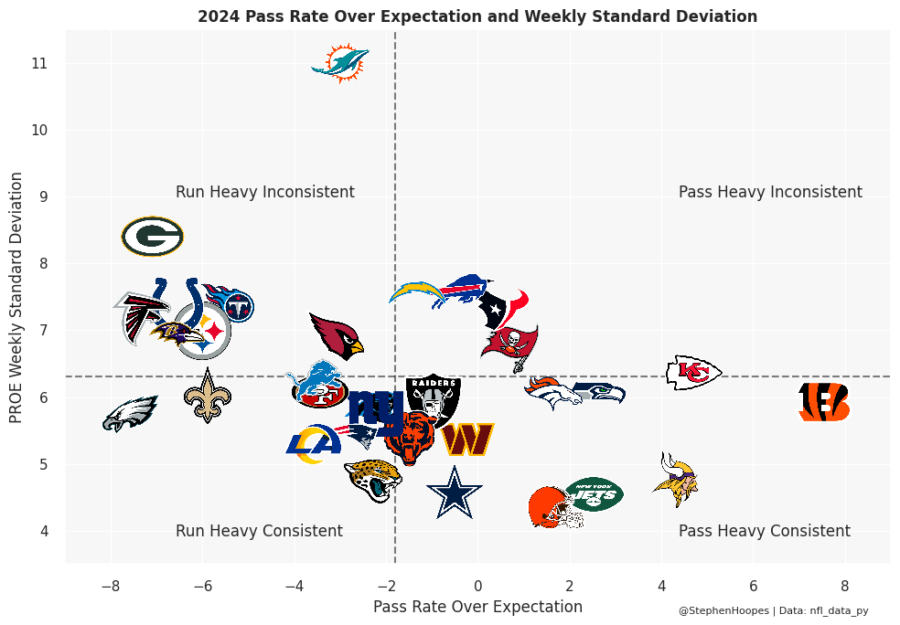 The graph below shows pass rate over expected (PROE) on the x-axis and how much that fluctuated weekly on the y-axis. It’s probably not surprising, given what I said above, that the Eagles and Bengals are on opposite sides of the graph. The 2024 Eagles had the second-lowest pass rate of any team since 2011. But extremely low pass rates like that almost always increase sharply the following season.