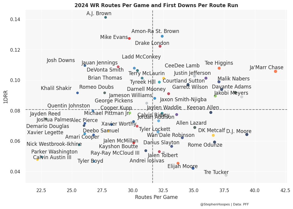 First downs per route run (1DRR) is another one of my favorite WR stats. It’s similar to yards per route run (YPRR) but normalizes some of the big variance plays like 90-yard touchdowns. I like to think of 1DRR as the success rate version of YPRR. The graph below is very busy, but I want you to focus on the top-left corner. The graph shows routes per game on the x-axis and 1DRR on the y-axis. Brown led the league in 1DRR among qualified WRs, landing second if Puka Nacua ran enough routes to qualify. We’ll get back to his number of routes per game later, though.