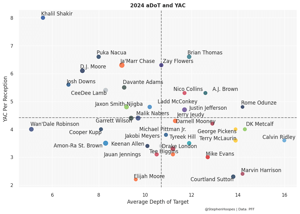 And Brown is not a catch-and-fall-down receiver. There is a negative correlation between average target depth and yards after the catch (YAC). That is to say, it gets more difficult to generate YAC on targets deeper down the field. But there are some players in the top-right quadrant of the graph below that still earn more YAC than you’d expect given their deep target depth. Brown is one of those players, along with other superstars like Brian Thomas Jr., Justin Jefferson, and Nico Collins.