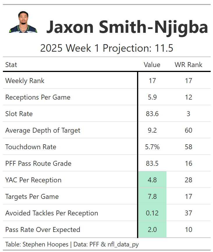 Jaxon Smith-Njigba (JSN) rebounded in 2024 after much hand-wringing following his rookie year. His WR22 finish on a per-game basis was rock solid. And that’s how I’d describe a lot of his underlying stats that we’ll dig into. But that WR22 finish does hide some extreme splits following DK Metcalf’s injury, a player who has now been shipped to Pittsburgh to deal with both Arthur Smith and Aaron Rodgers. I wouldn’t wish that fate on my worst enemy. I think JSN has the talent to really ascend in year three of his pro career. But my best instinct is he profiles as both a small-miss yet small-hit player, with both his after-catch ability and new offensive environment creating tail winds to his fantasy point potential. Let’s start with JSN, the player, before digging into his new competition and play-caller in 2025.
