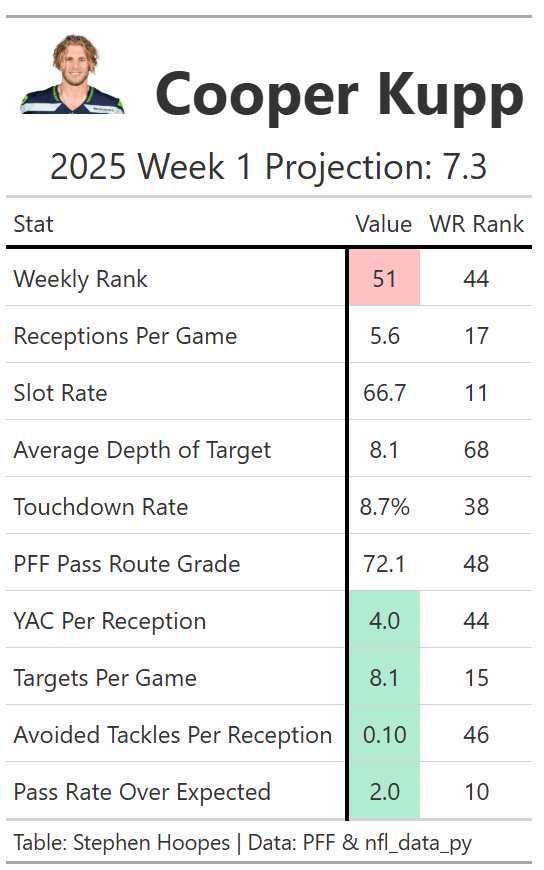 We have literally four snaps worth of data from this preseason to work with. JSN was lined up out wide on two of those snaps and in the slot for the other two. It’s obviously not enough of a sample to do anything with, but it’s what we’ve got so far. One other note about JSN is the slight concern I have with his route rate this season. I do think he’ll be out there in 2-WR sets. But he’s also the worst run blocker of the projected starting three WRs between Kupp, rookie Tory Horton, and himself. And as we’ll dig into below, I do think this is going to be a run-heavy offense. Just a small callout there but nothing I’m overly worried about.
